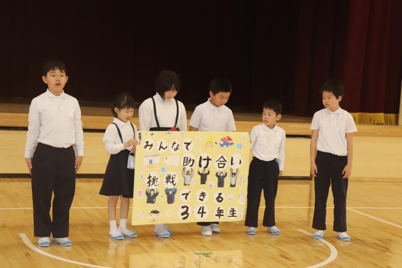 朝の集会で学級目標を発表しました。工夫を凝らして紙面を作り、動きを入れたりしながら工夫して披露できていました。