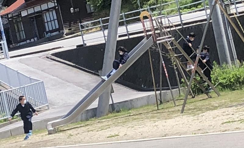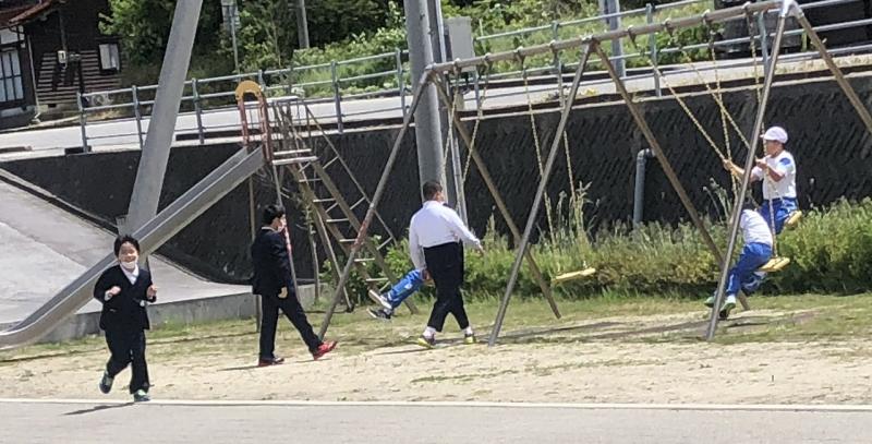 17:30…避難所の子どもたちが夕飯を待つ時間帯。集まって楽しそうに遊ぶことが恒例となっています。この日は、校舎内に子どもたの校歌の声が聞こえていました。校長室で保護者の方とお話をしていた時に、子どもたちの元気な校歌の声が聞こえてきて、思わず二人で笑顔になりました。何をしながらみんなで校歌を歌っていたのやら…「永久(とわ)に輝く 北斗星 漆黒照らすは 月明かり 風の香 かおる大谷に 生きる健児の 意気高し 夢と人の和誇らかに のびゆく学び舎 創りなむ」・・・胸に響きました。遠くなった海はこの日はきれいな青色でした。先週の青空の下での縄跳び練習の写真もご紹介いたします。