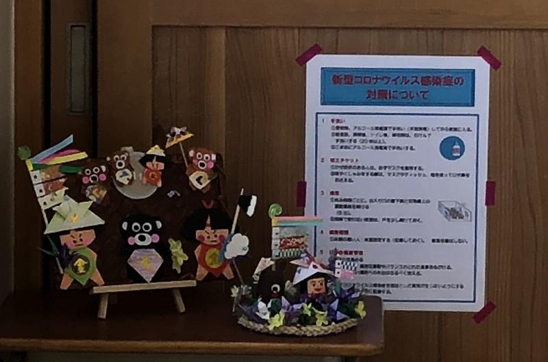 ランチルーム入り口で 5月人形がお出迎え ~調理員・二谷さん 打越さん・作~