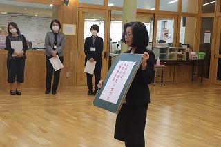 読書量の豊かな児童生徒の表彰のために、大谷子どもを育てる会・会長の丸山様と公民館主事・南様がご来校くださいました。学校全体として読書量の多かったみふゆさん、ひなさんが表彰され、「本を読むと心が落ち着きます。これからもたくさん本の世界に触れたいです。」とお礼の挨拶を行いました。学年ごとの表彰も行われ、副賞に図書券を頂きました。いつも子どもたちのために、ありがとうございます。