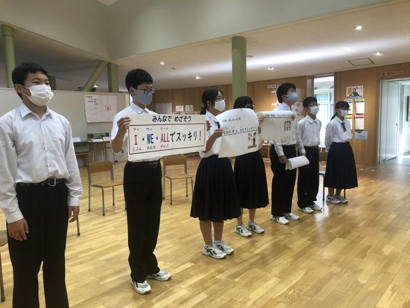 7・8年生が、10月からの授業で大切にすることを、寸劇で紹介してくれました。「一往復半」(考えを伝える・感想や質問をもらう・それに対してさらにコメントを返す)をめざし、「根拠・理由を示して自分の考え伝えてスッキリ!」「友達の発言つないでスッキリ!」について、全員で確認することができました。