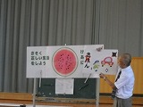 終業式では、校長先生のお話の後、生徒指導の先生から、夏休みの生活について図を使って分かりやすくお話がありました。