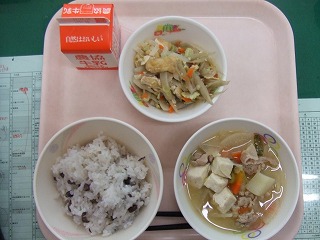 今日のメニューは、牛乳、小豆ごはん、あいまぜ、豚汁でした。