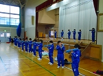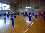 最初に書初め大会の表彰を行い、その後に、委員会発表、1年学年発表、最後にスペシャル企画として、全校で「ようかい体操第1」を踊りました。