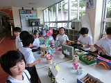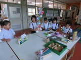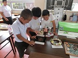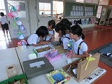 子どもたちが夏休みに製作した作品の展示会を今年度から行っています。工作や手芸、科学作品や自由研究など、子どもたちのがんばりがわかるものばかりです。早速こどもたちは友だちの作品を興味深そうに見ていました。
