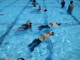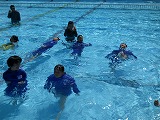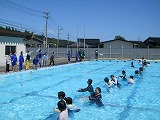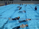 始めは服を着たままプールに入り、歩いたり、浮いたりしながらこれまでの水の抵抗力との違いを感じました。そして、ペットボトルを浮きに利用して浮く感覚を確かめました。子どもたちは泳ぎにくさを体感できました。こんなことが起きてほしくないのですが、これからは今日のこの訓練学習を生かしていってほしいと思いました。
