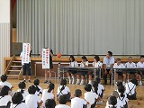 今月の生活目標は「時間を守ろう」です。運営委員と先生が寸劇をしながら時間を守ることの大切さを全校児童に伝えました。