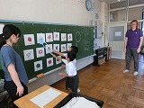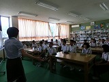 子どもたちは英語活動の時間を楽しみにしています。今回はこれまでに習った食べ物などの単語の復習をしました。一番盛り上がった活動は、赤白対抗の「はえたたきゲーム」です。ALTのスティーヴン先生の言った言葉を「はえたたき」で速くたたいた方が勝ち。楽しみながら覚えることができました。