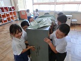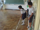 6年生は初めてのワックスがけです。3~4人グループで教室を中心に行いました。きれいな教室になるように隅から隅まで丁寧にワックスを掛けることができました。