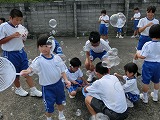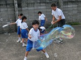 1年生と6年生のふれあい学習で「シャボン玉遊び」をしました。大きいシャボン玉ができるように6年生がシャボン玉液を準備してくれました。ハンガーやうちわなどの道具も用意し、1年生は楽しそうにシャボン玉を飛ばしていました。1年生に作り方を教えてあげたり、いっしょに飛ばしたりやさしく声を掛ける6年生の姿が頼もしく感じました。
