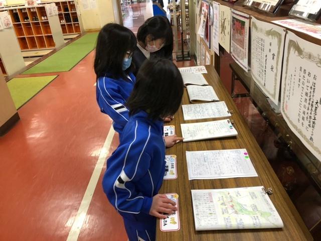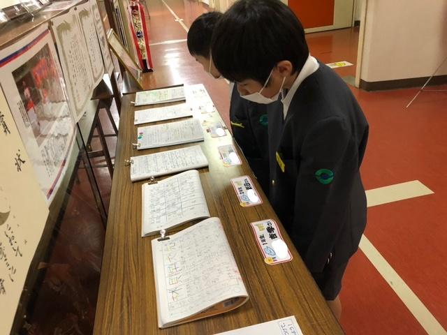 高学年に混じって低学年もなかなか頑張っていました。これからが楽しみです。職員室前の廊下に展示しました。さっそく友達のノートをじっくりと見ている児童がいました。