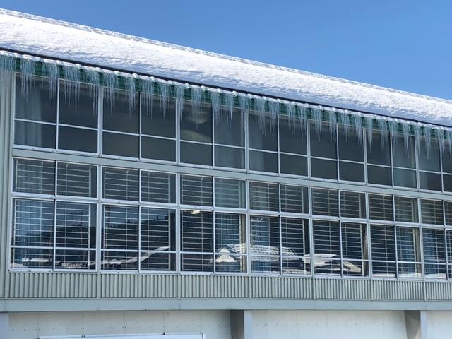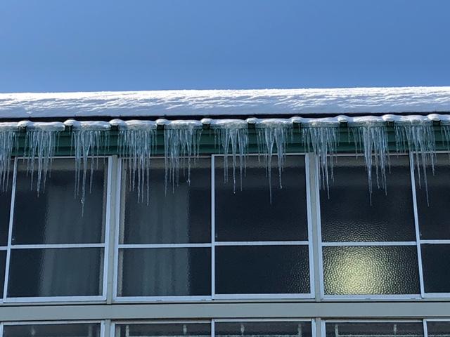 昨日よりも寒い朝でした。久しぶりに長い時間お日様が出ていました。体育館の屋根からたくさんのつららが下がっていました。