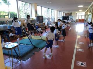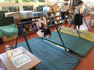 1階のワークスペースに鉄棒が設置されています。休み時間になると低学年児童が楽しそうに鉄棒をする姿をよく見かけます。1年生でも腕立て後転を連続でする児童もいます。
