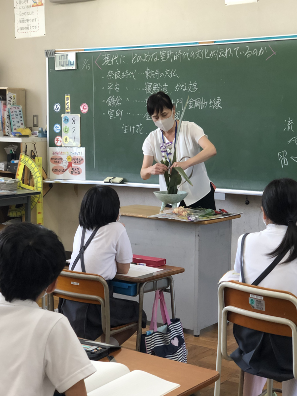 6年生は社会科の授業で、室町文化から始まった「生け花」が現在も受け継がれていることを学習しました。校長先生にゲストティーチャーに来てもらい、生け方の実演を見せてもらいました。