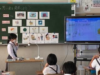 外国語「夏休み楽しかったことを話そう」の学習で、過去形を使って思い出を短いスピーチにして発表しました。単元の最後の時間でもあり、ALTのジュリア先生のチェック(評価)もあったようです。以前から比べるとスラスラと話せる児童が多くなりました。話すだけでなく、聞く力もついてきています。