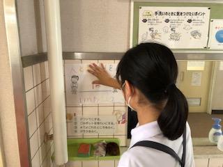 「学校の新しい生活様式」の取り組みが始まり、本校でも保健委員会がポスターを貼ったり、休み時間後の手洗いの啓発に活躍しています。