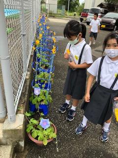 1年生がお世話しているアサガオが咲き始めました。花が咲いた児童は大喜び。反対にまだ咲かない児童は「どうして咲かないんだろう??」と少し寂しそうでした。