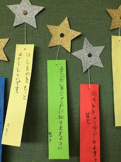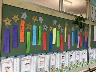 七夕がもうすぐです。1年生は短冊に願いごとを書きました。みんなの願いごとは廊下に掲示されました。