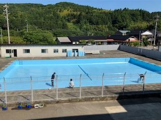 2020年6月24日 08時58分先週からプールの塗装工事をしています。これまでの塗装をはがした後に、下地塗り。昨日はいよいよプールの色の水色の塗装が行われ、きれいに塗られました。