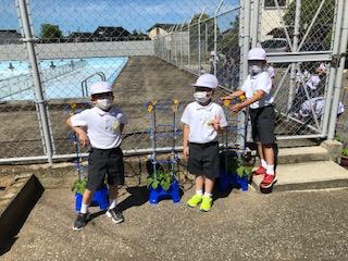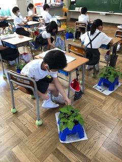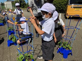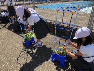 1か月ほど前に種を植えたアサガオは、1年生のお世話で葉っぱも増え、大きく育ってきました。葉っぱの観察をした後に支柱を立てました。ぐらぐらしないようにしっかりと穴にはめ込む作業をしました。これからもしっかりとお世話をして、どんどん大きく生長する様子を楽しみます。