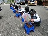 分散登校の今日、1年生はアサガオの種植えをしました。教室で植えるために必要なものを話し合った後、児童玄関前で植えました。