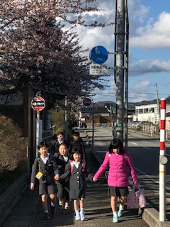 校門の桜も満開に近い状態でとてもきれいに咲いています。子どもたちも元気に登校しています。1年生が上級生に手を引かれてうれしそうです。