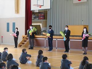 午前中に修了式が行われました。午後からは卒業生も登校し、離任式が行われました。今年度は5名の先生方が転任されました。別れは寂しいですが、これからも大屋っ子を応援しているというお話に子どもたちも嬉しそうでした。お別れする先生方も新天地で頑張ってください。