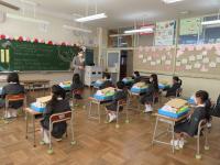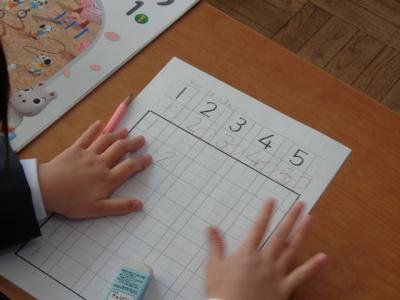 1年生が、算数で数字の1~5を練習していました。10人とも丁寧で上手な数字でした。3について苦労しているようでしたので、ご家庭でも、練習に取り組んではいかがでしょうか。