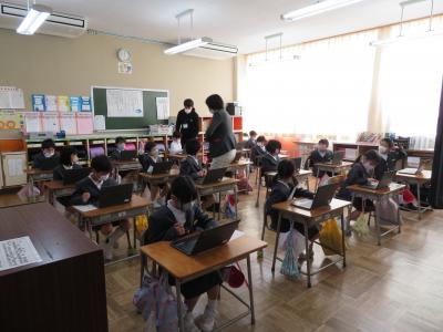 昨日貸与されたパソコンに、2年生がそれぞれのIDやパスワードを入力し、インターネットに接続して、授業で使用していました。
