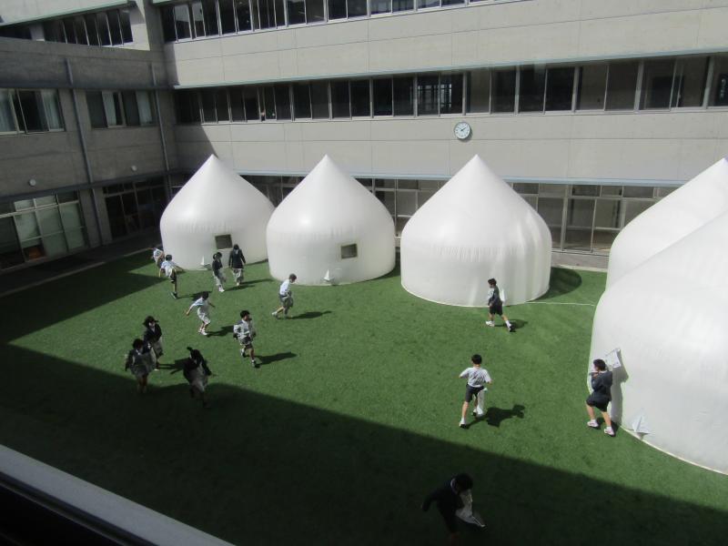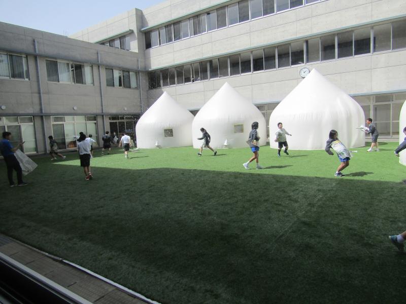新聞紙を落とさないように思い切り走り回る6年生たち!