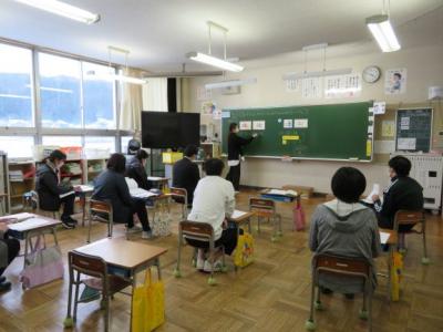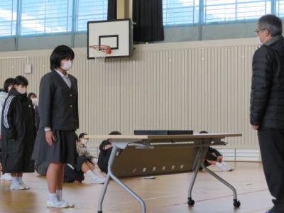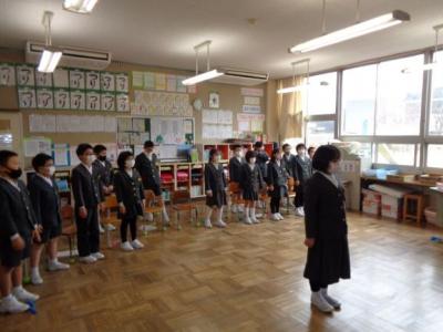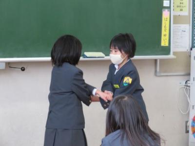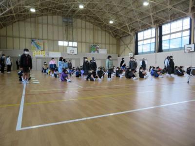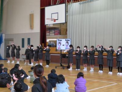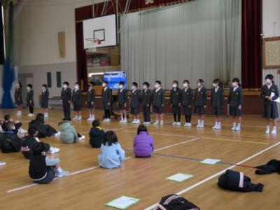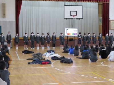 書き初め大会の表彰と英語を使った5年生の学年発表がありました。