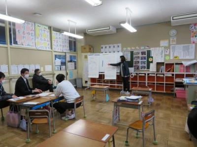 授業者が子ども役の教師たちとシミュレーションをして授業内容を考えます。