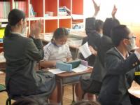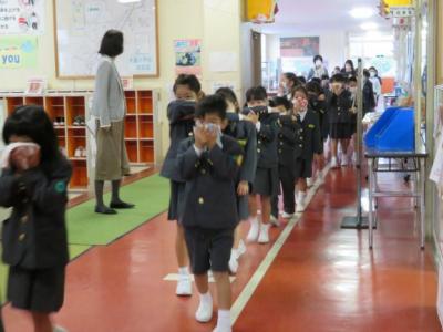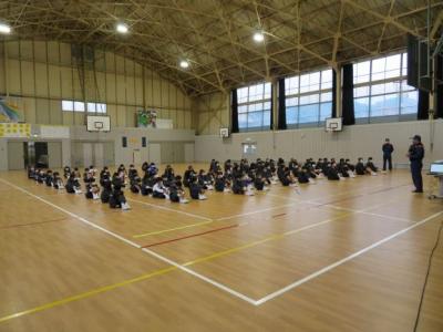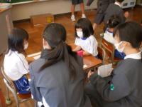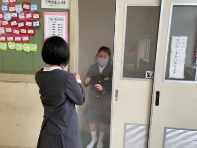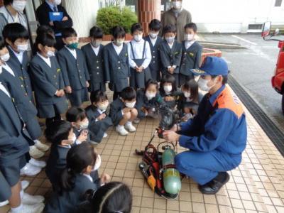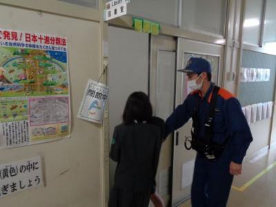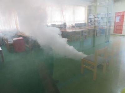 図書室で火災時の煙(安全なものです)を児童全員が体験し、適切な避難方法を学びました。