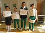給食が終わってすぐにランチルームで学校長の手から4人の入賞者に表彰状が手わたされました。