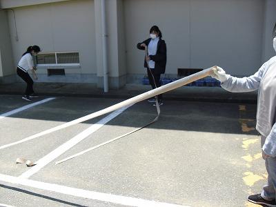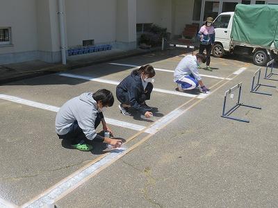 玄関前の駐車スペースのラインが消えてたので,職員で白線をガムテープとスプレーを使って作りました。