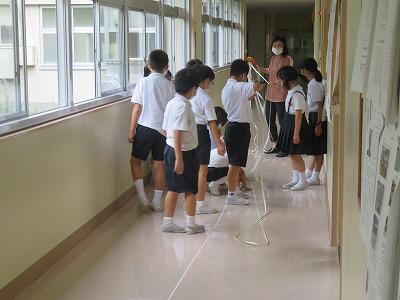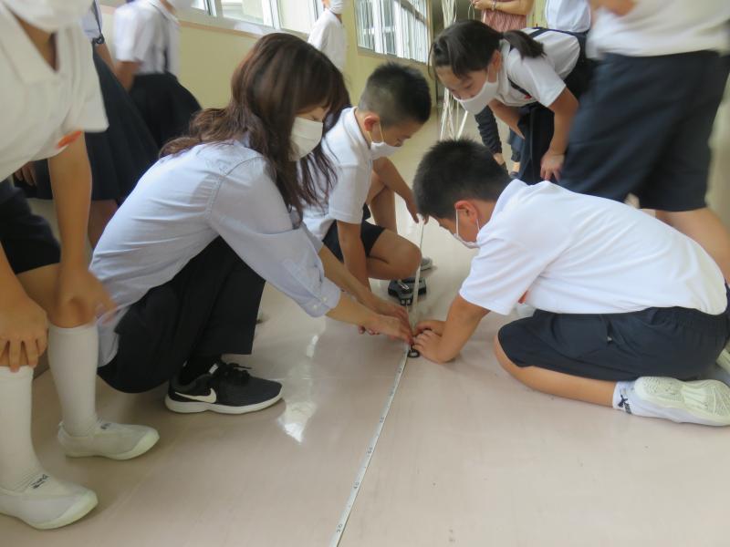 算数の学習内容「長さ」で,体育館の前から家庭室の前までの廊下の長さを巻き尺をいくつか使って計測をしていました。