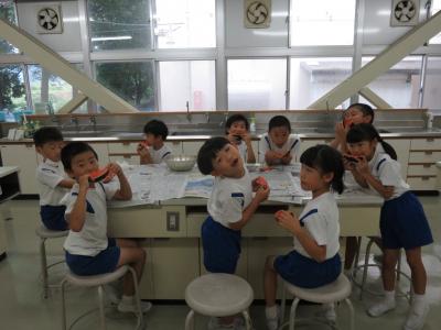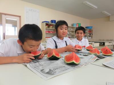「おいしい,おいしい」と言いながら食べていました。別にできた2年生の大きなスイカを他の学年にもわけてあげると言っていましたが,今日のスイカがおいしかったので気が変わったそうです。2年生だけで食べることになったそうです。