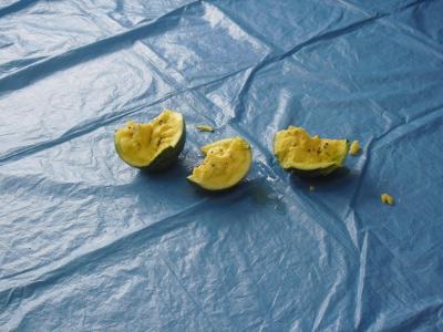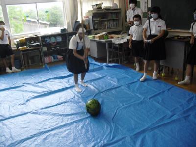 そして,6年生 まずはスイカ割りをして楽しみました。黄色のスイカでした。