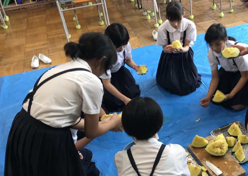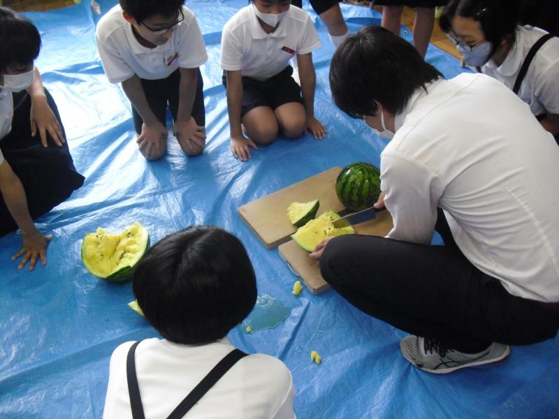 1学期の最後の日に,畑でできたスイカを食べた学年がありました。