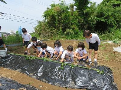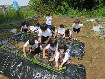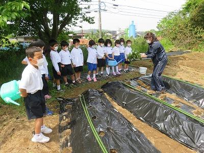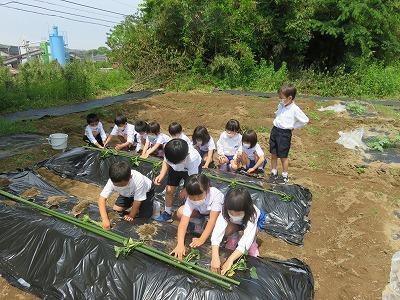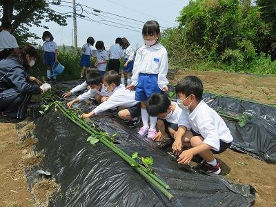 1年生がサツマイモの苗を植えました。25本の苗をみんなで協力して植えました。初めての体験でみんなとても楽しそうでした。