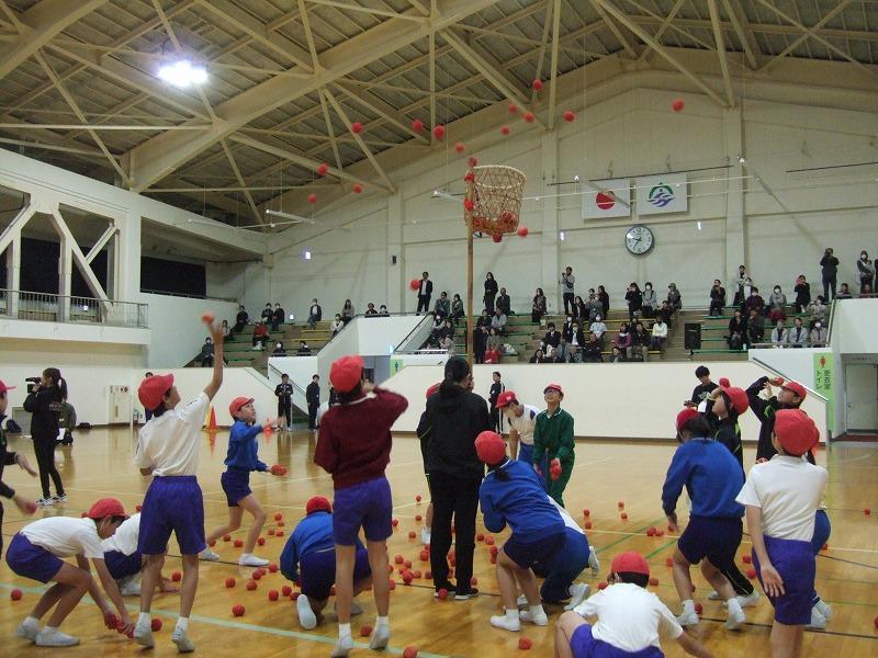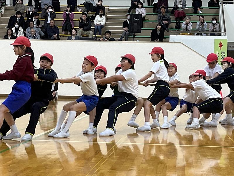11月19日に、来年度開校予定の「押水小学校」と「志桜小学校」の2校に分かれて、5・6年生がミニ運動会を開催しました。種目は、玉入れ、大玉転がし、綱引き、リレーの4種目で、押水第一小の児童は、宝達小、相見小の児童とペアやグループになって、競技をしました。