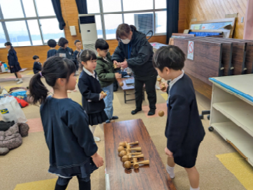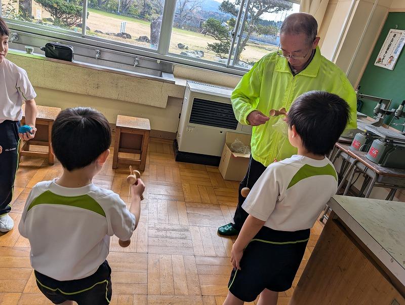 今年は8名のボランティアの方に来ていただき、「コマ回し」「お手玉」「おはじき」「けん玉」「あやとり」の5つの遊びを教えていただきました。