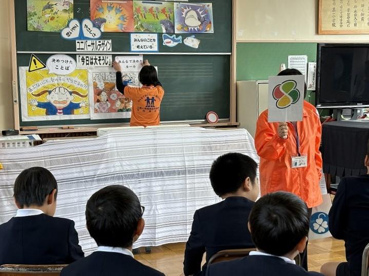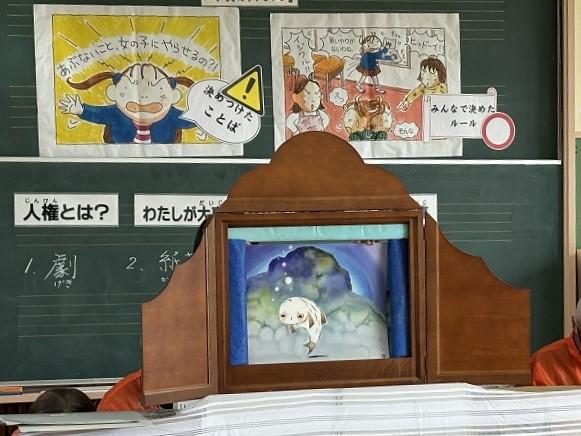人権教室では、「人権とは何か」を考えるために、人権擁護委員の方がわかりやすく、楽しく寸劇や紙芝居をしてくださいました。また、だれにとっても使いやすいユニバーサルデザインについても、実際の品物を提示しながら丁寧に説明してくれました。