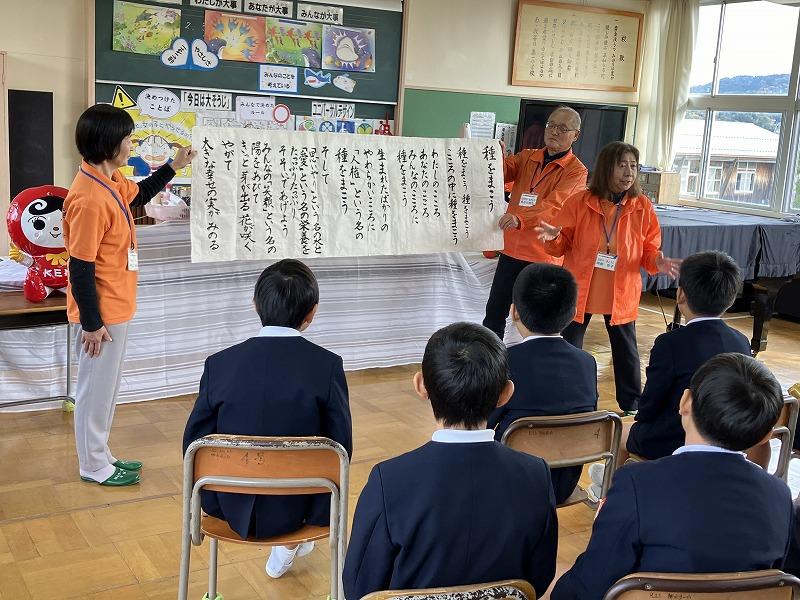 12月4日から10日までの「世界人権週間」に時期をあわせて、今年も押水第一小学校では11月26日に3・4年生を対象に「人権教室」を開きました。講師は、宝達志水町の人権擁護委員の皆様です。