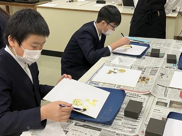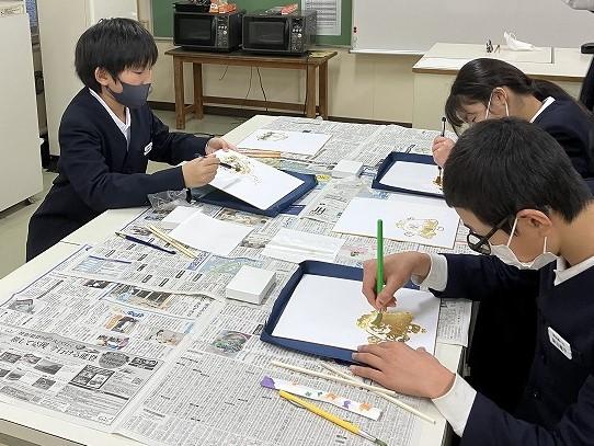 1月23日(木)の5限目に箔押体験をしました。県の伝統工芸である箔押し体験を通して、町のシンボルである宝達山で過去に金が発掘された歴史を知り、郷土への理解を深め、郷土を愛する心を育むのが目的です。金沢の「箔座」という会社から来ていただきました。その会社の方(金箔先生)に、金箔の説明を受け、箔押し体験をしました。インストラクターの先生も3名来られ、丁寧に教えていただき、素敵な色紙が出来上がりました。