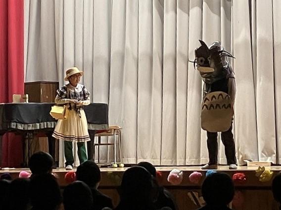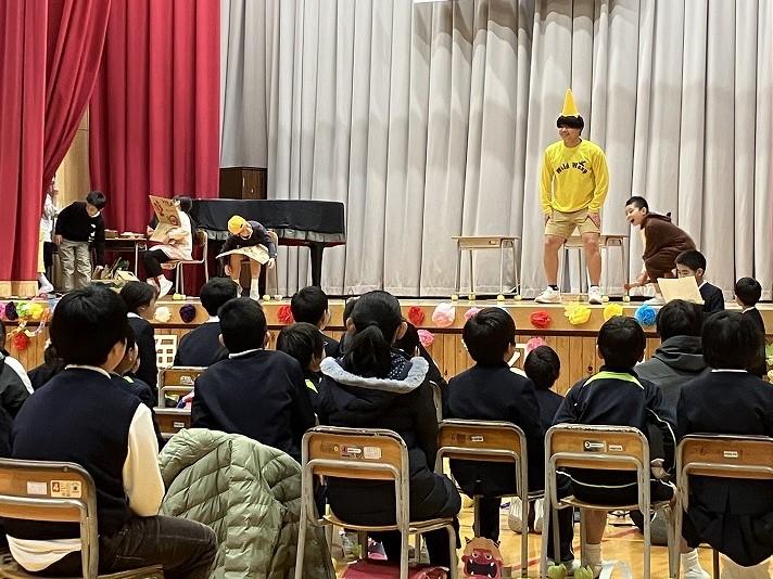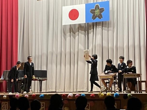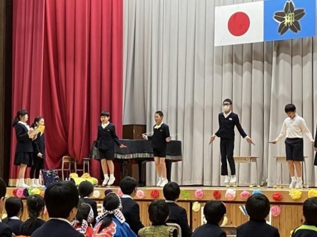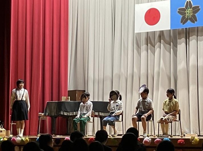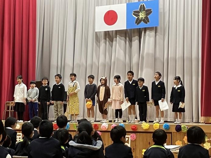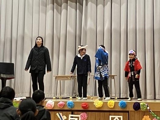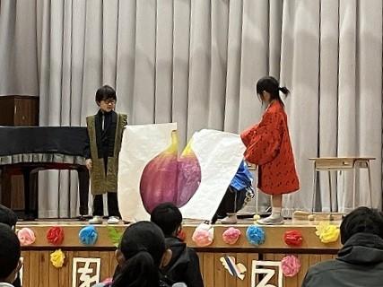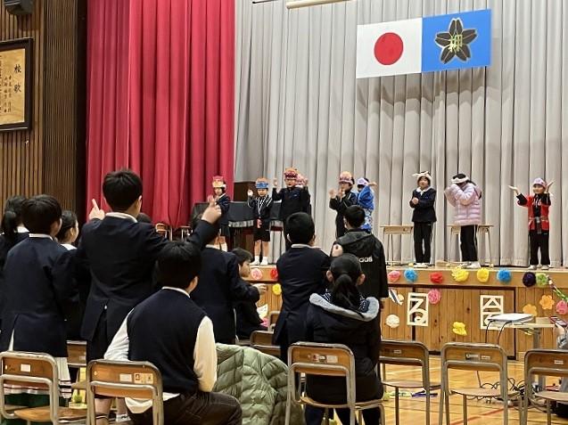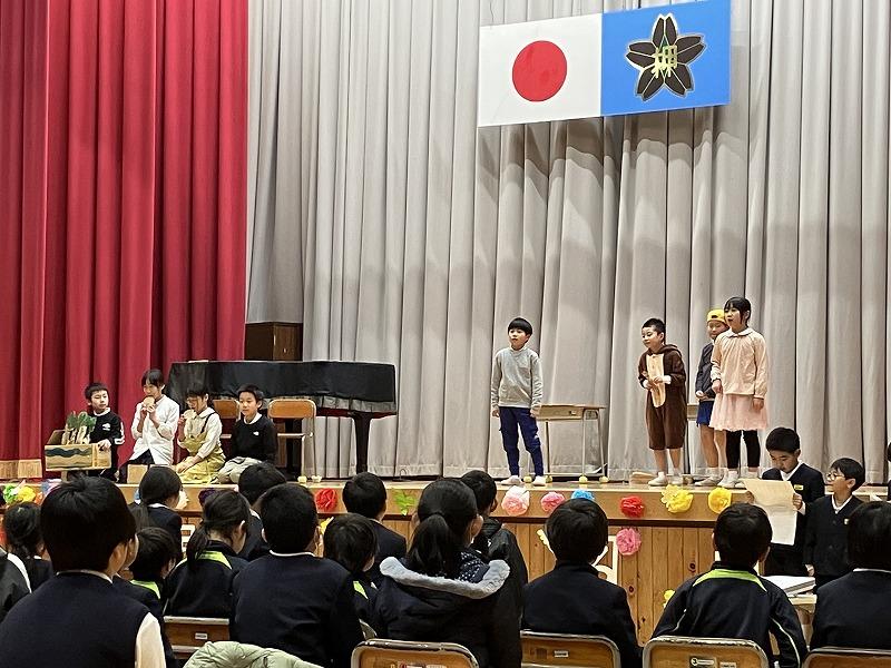 2年生は、桃から生まれた「桃太郎」を、宝達志水町特産のいちじくから生まれた「だい一たろう」にした楽しい劇を披露しました。途中、6年担任の茶木先生がだい一たろうのお供に交じって登場した時は大いに盛り上がりました。無事に鬼退治をした後、2年生が全員で「鬼のパンツ」を踊ったところ、ステージ下で見ていた6年生はじめ他の学年も踊りはじめ、会場が一体となりました。
