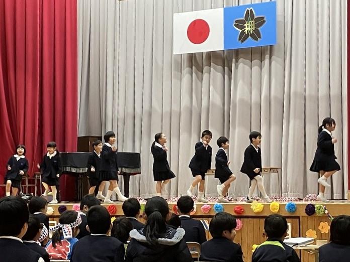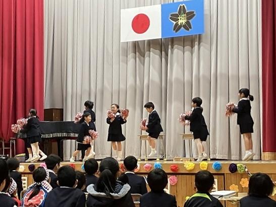 1年生は、「タイムスリップ?!6年生おめでとう」と題して、6年生が小学校に入学した時の様子を劇にしたり、その時流行っていた DA PUMP の「U.S.A.」を踊ったりしました。6年生は、1年生が一生懸命演じる姿を見ながら、その頃の自分を思い出していたのではないでしょうか。また1年生は、6年生が生まれた頃に流行っていた曲であるきゃりーぱみゅぱみゅの「つけまつける」も踊りました。「U.S.A.」も「つけまつける」もとても1年生らしく上手に踊って会場があたたかい雰囲気になりました。