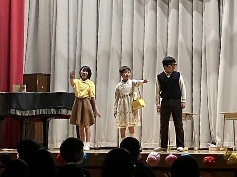 3年生は、「ジョージがやらかした」と題した劇とクイズを披露しました。「サザエさん一家」のとなりに「おさるのジョージ」が引っ越してきて、波平の高価な盆栽を壊してしまうトラブルが起きてしまうけれど、みんなで協力して楽しく解決していくお話で、3年生自身がストーリーを考えたそうです。3年生一人一人がサザエさん一家やジョージの特 徴をよくとらえて、とても上手に役になり切って演じていました。
