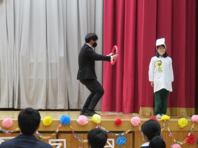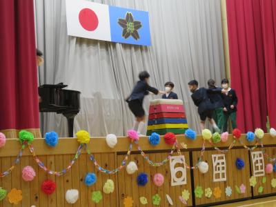 6年生,一人ひとりの個性が劇にうまく反映されています。在校生に,6年生らしい劇を見せてくれました。そして,劇中には,1分間に縄跳びの八の字跳びを100回以上跳ぶという設定も見事クリアし,会場から大きな拍手をもらっていました。