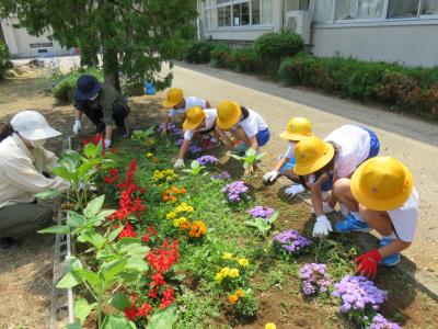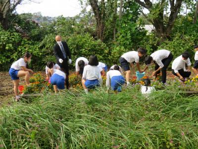 1年生は正面の花壇の草むしりをしました。